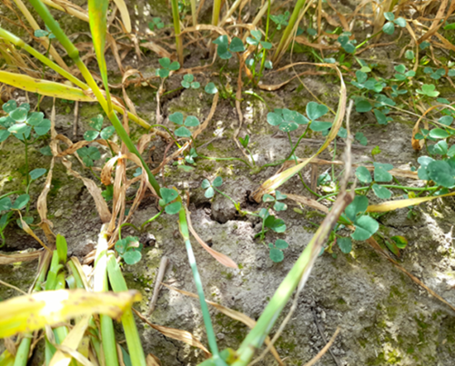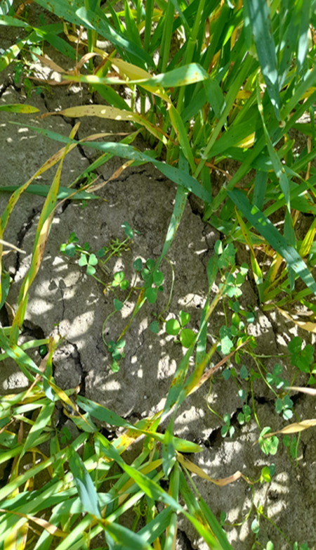 Kesäkuun alussa kaikki kerääjäkasvit olivat itäneet ja tulleet pintaan. Ainoastaan vantaiden kautta maan sisään kylvetty niittynurmikka ei itänyt. Kovat helteet sekä satamattomuus aiheuttivat sen, että pelto oli todella kuiva ja pellon pinta halkeili.