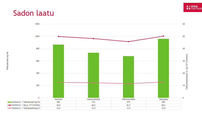 Sadon laatutulokset olivat yllättävät. Heinämäisten kerääjäkasvien läsnäolo vaikutti negatiivisesti sekä itse valkuaispitoisuuteen, että valkuaissatoon. Lisäksi niiden läsnäolo alensi jyväkokoa. Yllättää oli etenkin, kuinka voimakkaasti niittynurmikan läsnäolo aiheutti laadun alenemaa, koska hyvin pienenä ja vaatimattomana heinänä sen oletettiin vaikuttavan lopputulokseen hyvin vähän. Lähes yhtä suurena yllätyksenä oli valkoapilan läsnäolon positiivinen vaikutus sadon laatuun. Valkoapilan läsnäolo nosto sekä valkuaispitoisuutta että jyväkokoa ja sen seurassa kasvanut vilja tuotti suurimman valkuaissadon.