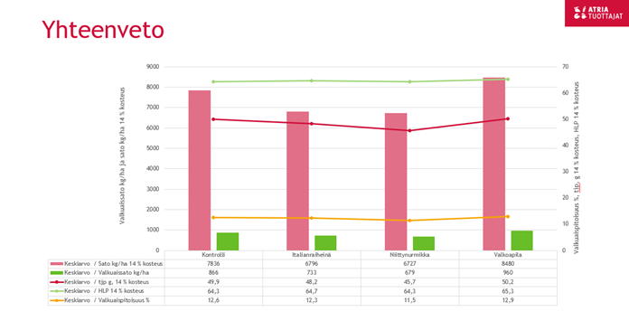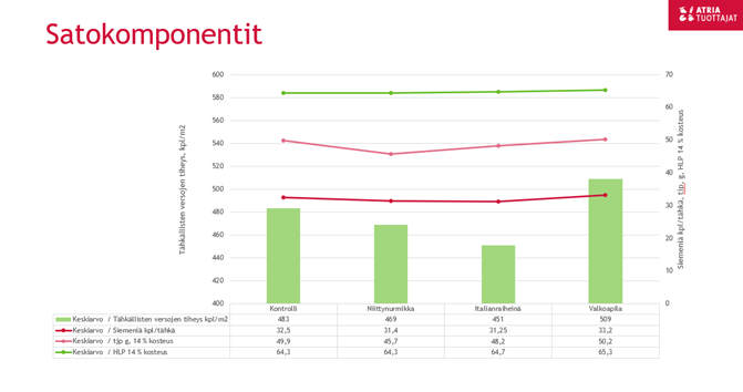 Heinämäisten kerääjäkasvien vaikutus heijasteli myös satotasoon, sillä näillä koekaistoilla oli yli tuhat kiloa heikompi satotaso verrattuna kontrollikaistaan. Valkoapilan läsnäolo näkyi päinvastoin positiivisena, koska satotaso oli 600 kiloa parempi kontrolliin nähden. Koe jatkuu kasvukaudella 2022 kerääjäkasvien esikasvivaikutuksen arvioinnilla.
