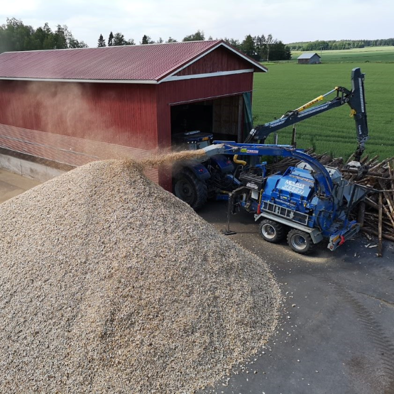 Aamupäiväksi oli sovittu toisen broilerituottajan kanssa puun hakettamisesta. Meidän tilalla siirryttiin hakelämmitykseen vuonna 2003, jonka jälkeen kymmeniätuhansia litroja lämmitysöljyä on korvattu kotimaisella bioenergialla. Haketus sujui nopeasti ja puu oli yllättävän kuivaa. Loppupäivä meni siirrellessä haketta varastoon talvea odottamaan.