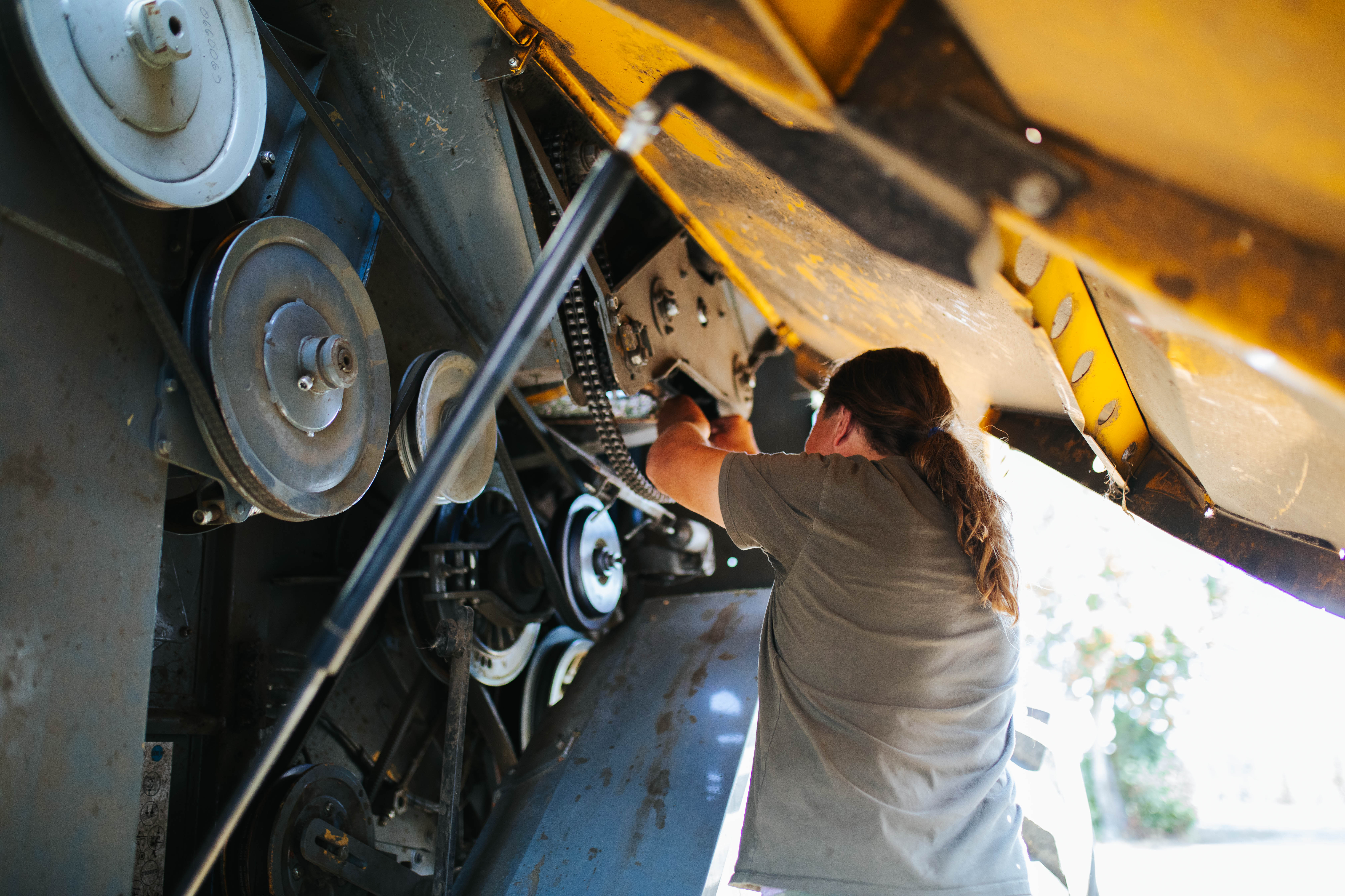 Saan lohkon puitua ja ajan puimurin kotiin. Tyhjennän säiliön, mutta tyhjennysketju katkeaa taas. Korjaamme sitä melkein tunnin ja tyhjennämme purkuruuveja käsin, jotta ketju ei katkeaisi uudelleen. Juuri kun puimuri on jälleen kunnossa, rakennusmiehet ilmoittavat, että nostokoriauton tukijalat eivät suostu nousemaan. Käyn nostamassa ne ylös ja parkkeeraan auton kotipihaan.
