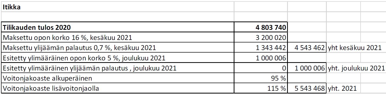 Korko maksetaan vuoden 2020 alun osuuspääomatilanteen mukaan. Ylimääräinen voitonjako maksetaan jäsenille 14.12.2021.