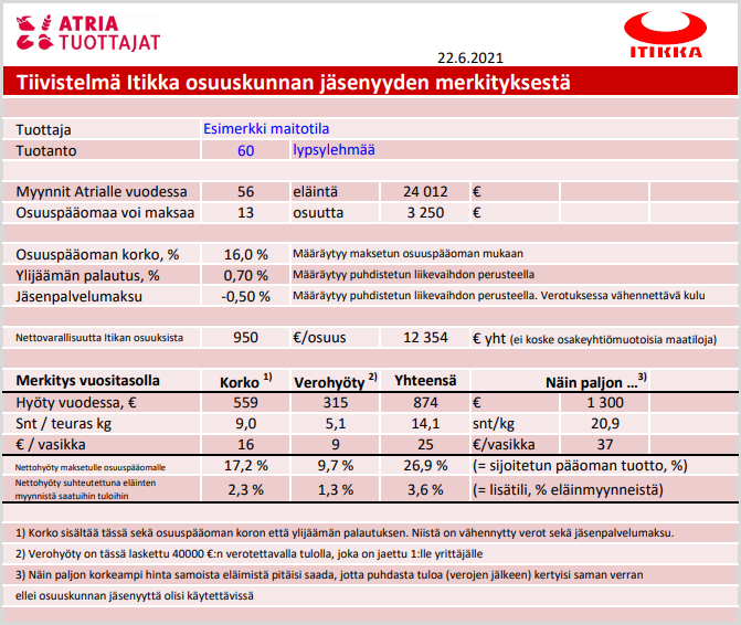 Osuuskunnat ovat julkaisseet mallilaskelmat osuuskunnan jäsenyyden taloudellisista hyödyistä Lihakunnan ja Itikka osuuskunnan sivustoilla. Tilakohtaisia laskelmia laaditaan Nautasuomi Oy:n asiakkuuspäälliköiden toimesta.