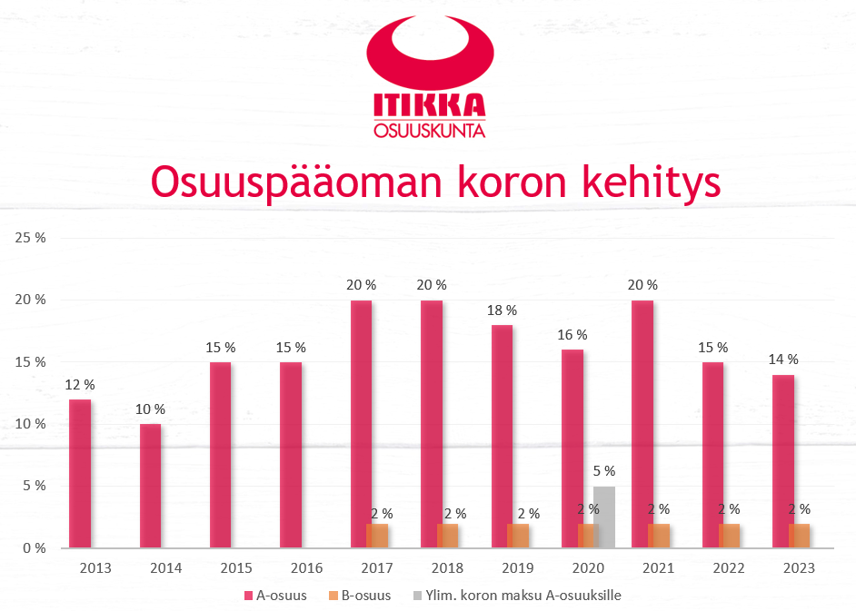 Itikka osuuskunnan vuoden 2024 verotuspäätöksen mukaan A-osuuden vertailuarvo tuloverotuksessa vuodelle 2025 on 815,68 euroa. Tätä vertailuarvoa jäsenet käyttävät vuoden 2025 verotuksessa. Osuuden nimellisarvo on 250 euroa.