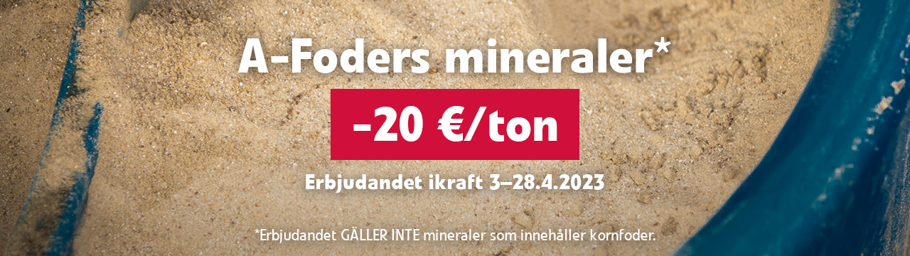 Under tiden för erbjudandet 3.-28.4.2023 kan du beställa A-Foders mineraler *med 20€ rabatt per ton.