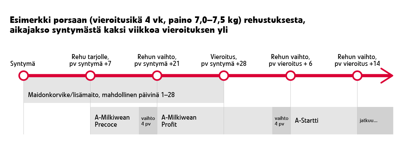 "Koskenkorvan ja Mynämäen tehtaissa valmistettava A-Startti on suunniteltu jatkamaan rehustusta niin, että porsaan kaukalosta löytyy samoja tuttuja makuja ja raaka-aineita, joihin porsas on tottunut jo ensimmäisinä elinviikkoinaan A-Milkiwean rehuista."